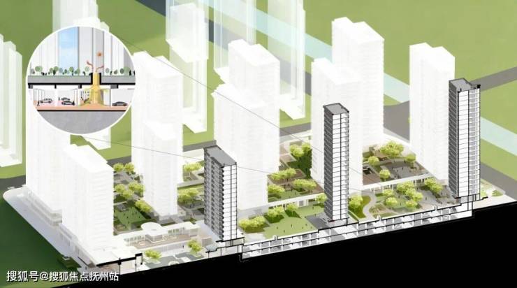 为彻底消融城市与社区的界限,项目以“超级底盘”重构社区基座。通过抬高地库、整合车站与商业配套,将地下空间转化为多功能垂直枢纽。