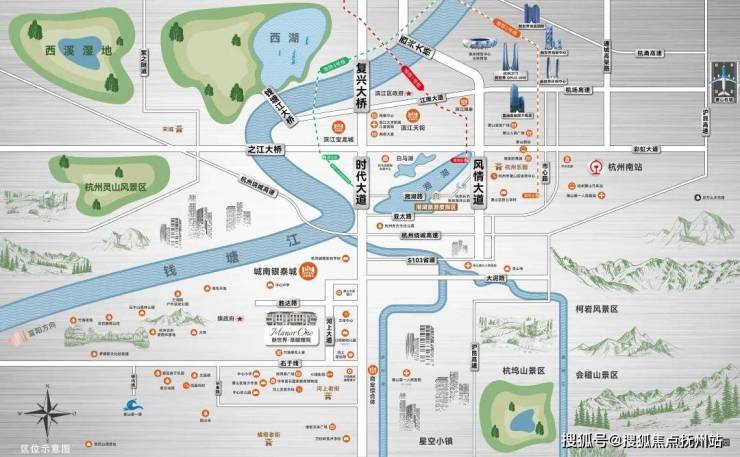 时代大道贯通河上,快速链接武林、湖滨、钱江新城、滨江、钱江世纪城等主城核心区,与杭州绕城高速、彩虹大道、江南大道、秋石高架等道路相连,形成四通八达交通网,构筑半小时杭州都市圈。