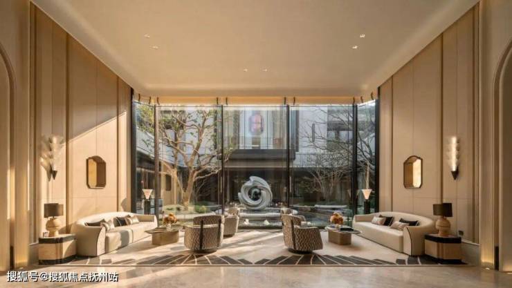 约76米超宽尺度的双子门庭与约9.4米挑空,构成了归家的第一重仪式。