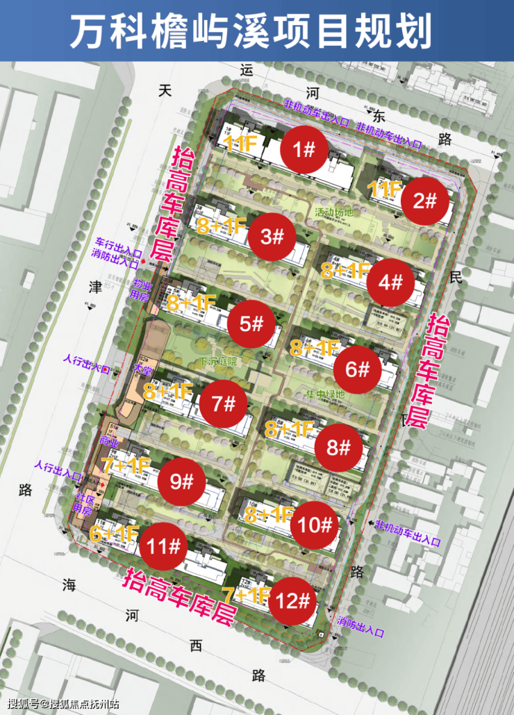 下面我们来看项目几个细节,很让人眼前一亮:1、抬高车库层:注意看,万科檐屿溪的规划图上有一项标注是:车库抬高层,也就是说,项目的车库不在地下,而是搬到了地上,整个小区有一种在“空中”的感觉。