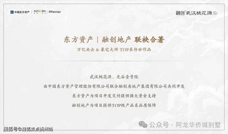 ◇东方资产 四大AMC之首项目由中国东方资产管理有限公司联合融创地产集团有限公司共同开发。东方资产在融创武汉桃花源光谷壹号院两大项目中持股比例为60%,累计注资高达51亿元。东方资产成立于1999年10月,是经国务院批准,由中华人民共和国财政部、全国社会保障基金理事会共同发起设立的中央金融企业,由中华人民共和国财政部进行全资控股,位列中国四大资产管理公司之首。