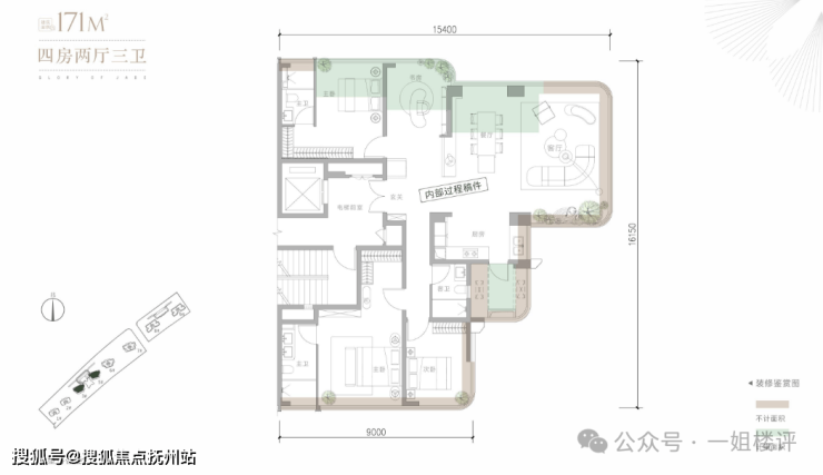 另外,该户型也是双套房设计,北侧套房挨着电梯井,可能会有噪音影响。