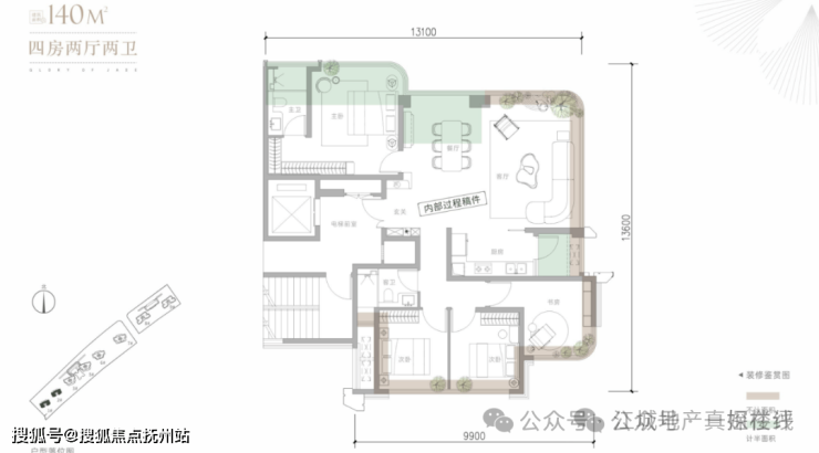 其中,2号楼中是建面约140平四房两厅两卫户型: