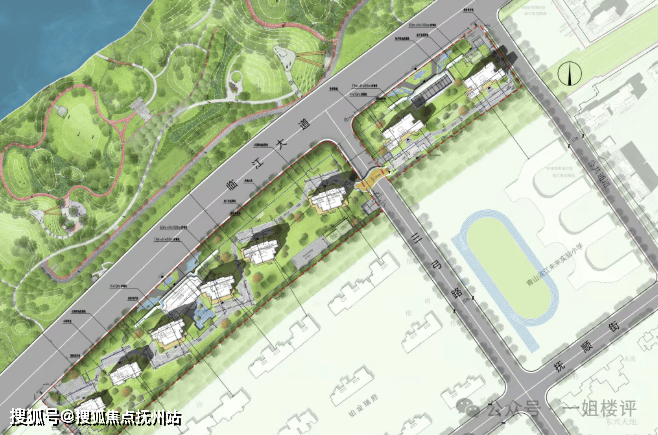 值得一提的是,项目被三弓路隔离成了两个地块,其中东侧地块仅2栋楼。且两个地块有独立的大门入口,都位于临江大道边上。