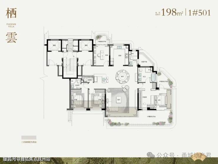 高层户型面积段195㎡、198㎡、207㎡和顶复338㎡(各户型大体一致,区别体现在露台分布上)。