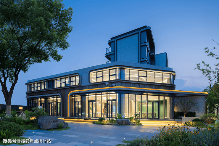 最终,该金属光带系统与商业配套建筑的立面设计形成精准对位——通过材质延续、色彩呼应及线性逻辑的深度关联,实现从入口飘板到围墙界面,再至商业建筑的完整视觉闭环。
