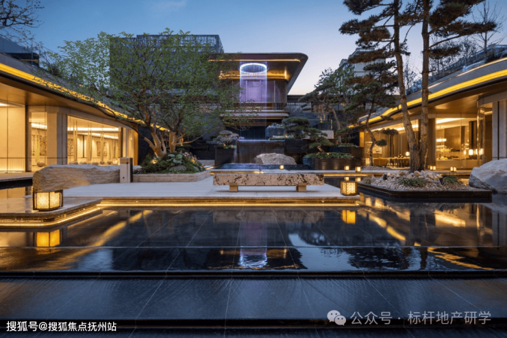 西侧的车行归家入口的设计也绝对值得借鉴:跨度约60m,尺度非同一般,透光云石、深色石材以及跌水景观的搭配,生动且富有诗意,柔和的色调使观感愈发深邃。