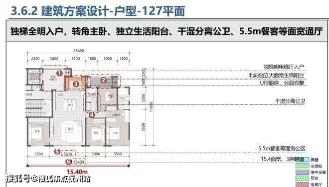 128平户型:面宽15.4米,客厅宽5.5米,四开间朝南。
