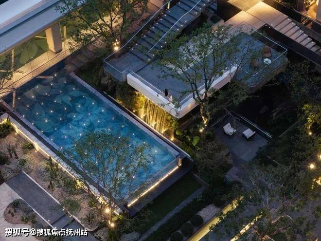 首创立体式度假园林,以约1800㎡立体中心庭院,通过层层退台将山水园景搬进社区,以小尺度景观场景升温日常度假感。
