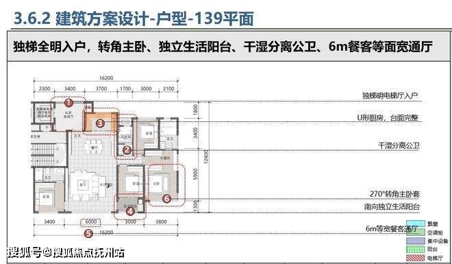 139平户型:面宽16.2米,客厅宽6米,四室三卫。