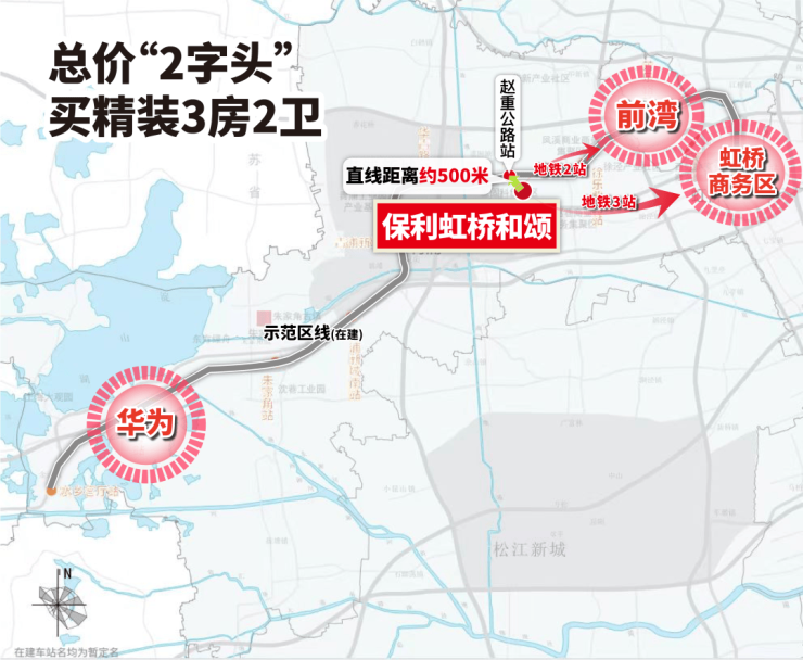 保利虹桥和颂预约热线:400-116-2990☎第一大特征是轨交房,直线距离示范区线(在建)仅约500米,是板块内少有可轻松至轨交站点的新房。