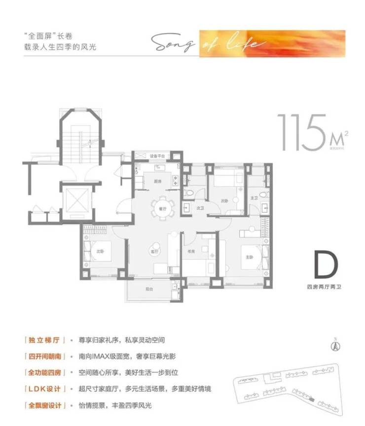 该户型做到了同面积段罕见的四开间朝南+四房设计,南向IMAX级景观面,卧室阳光满溢,功能性也拉满。
