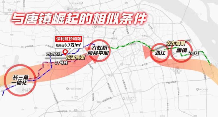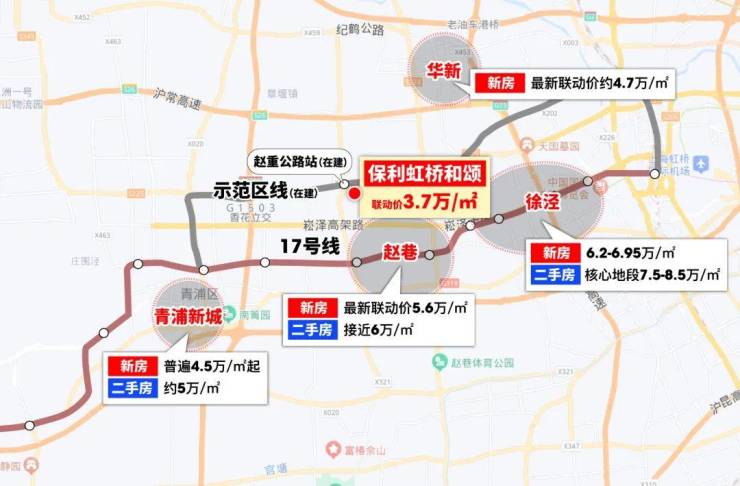 项目和赵巷离大虹桥核心距离相当,但赵巷最新联动价已达5.6万/㎡,华新最高联动价4.7万/㎡,甚至17号线下游青浦新城已普遍4.5万/㎡起。