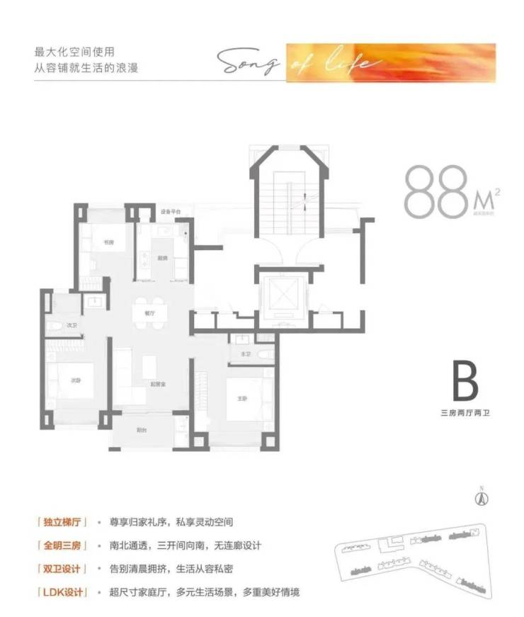 3房2卫可太难得了!一方面,用建面88㎡面积做出市场百平米的功能性,相当于少花了12㎡的钱。