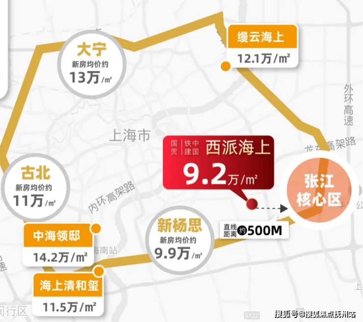 西派海上项目与上海内环直线距离仅约2.2公里,几乎是目前内中环新盘中距离内环线最近的项目。