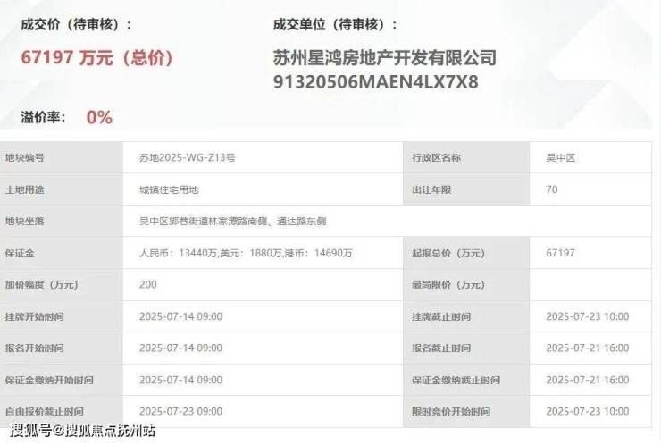 2025年7月23日,苏州星鸿房地产开发有限公司(星河集团与天鸿伟业联合体)以6.72亿元总价竞得吴中区郭巷街道苏地2025-WG-Z13号地块(星河.湖西源启)。