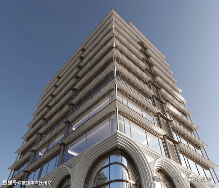 项目的外立面采用香槟金铝板搭配弧面玻璃,以及“鎏金冠顶”设计,这种设计思路已经被运用到武汉好几个四代住宅上了。