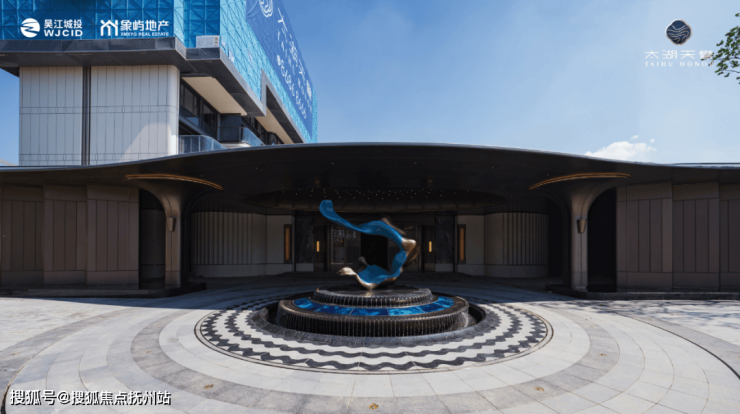 项目实景示范区已公开,【门庭礼迎】约43米宽境门庭,三维铝板柱帽阵列而立,暗金珠光曲线穹顶温润流光,玻利维亚蓝奢石轻奢点缀,宝格丽酒店同款维纳多哑光石材,【环岛落客】水袖雕塑以现代艺术语言翩然起舞,尽显豪宅气场。
