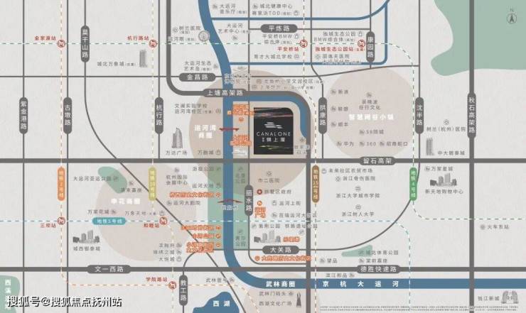 项目毗邻世界文化遗产京杭大运河,与西湖、良渚古城遗址共同构成杭州文化金三角。西侧通过丽水路隧道直通运河湾国际文化走廊,东接智慧网谷数字经济小镇,兼具历史底蕴与现代产业动能。