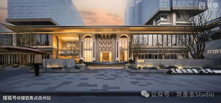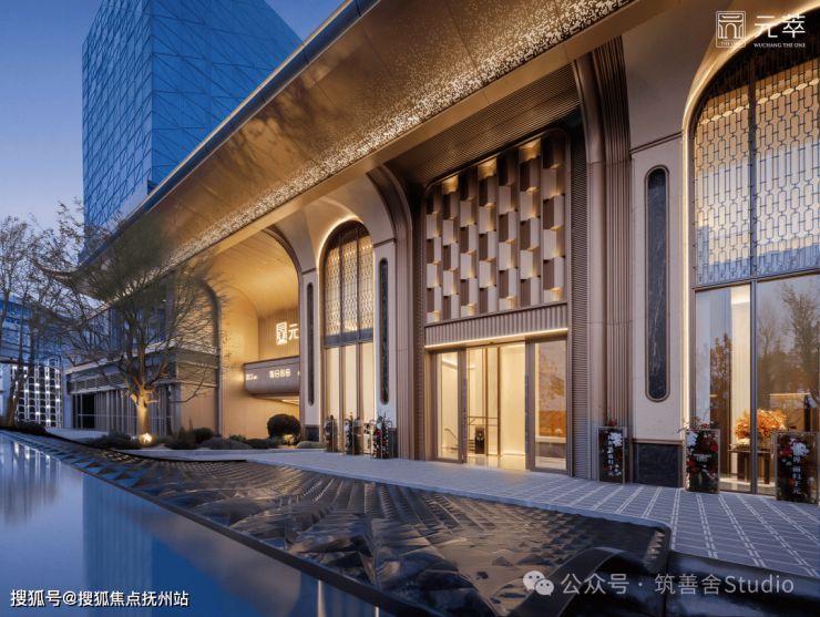 建筑立面以现代公建化手法为基底,巧妙融合金属铝板、玻璃幕墙与天然石材,萃取千年“仪门”及贡院古建筑拱门的经典元素,并融入国际前沿审美中的扎哈曲线立面设计,完美呈现国际风范与东方神韵交织的建筑美学。