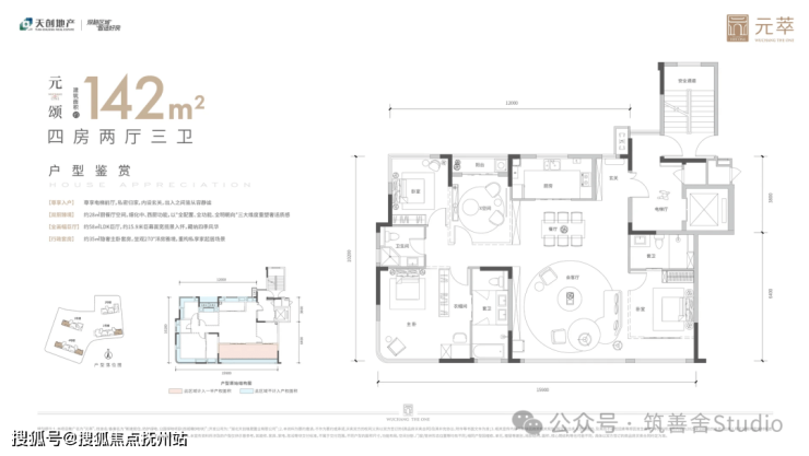 建筑面积约142平方米的四房三卫户型:边户配备独立电梯前室,南向拥有超大阳台与大花池,两个卧室更可享受双面飘窗设计,空间利用率极高;北向多功能空间同样设有飘窗、空调机位及设备平台等优化配置。
