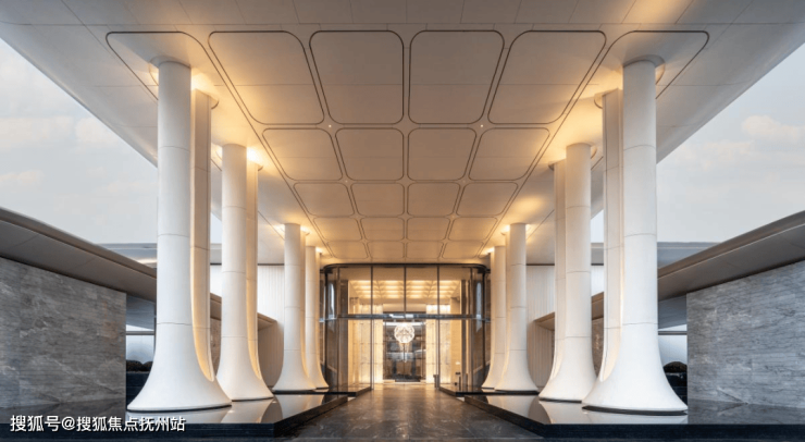 2.超尺度礼序入口:宽约21米、高约10米的社区主入口,强调礼序空间及超尺度的形象,通过两列8颗UHPC仿石巨柱及超大雨棚,营造庄重感与震撼感,强化项目形象IP。