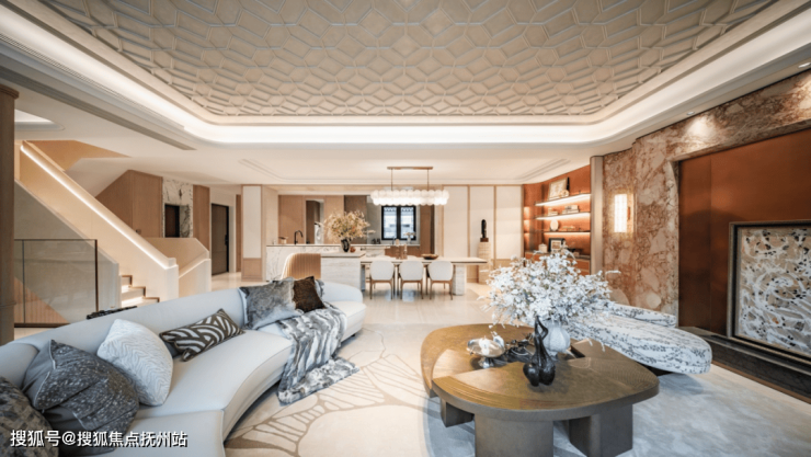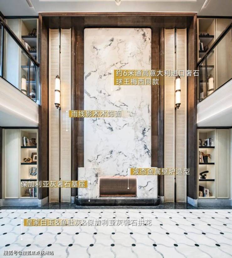 地下一层打造约110㎡、超6米挑空通厅,气场堪比超大奢宅。约6米主背景墙采用梅西同款意大利芬迪白奢石,搭配雨线影木与法式卡帕叠斯级工艺,百万级成本铸就镇宅质感。地面由保加利亚灰、意大利鱼肚灰、伊朗皇家白玉精工拼花,工料价值近两百万,老钱风格调拉满。
