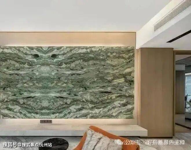 意大利卡拉拉原矿的多款大理石,奢侈地漫铺于地面和墙面上,公区背景墙则采用巴西进口石材天宝石,纹理与色泽好似青绿山水,质地却温润如玉,正是观云钱塘城的同款。