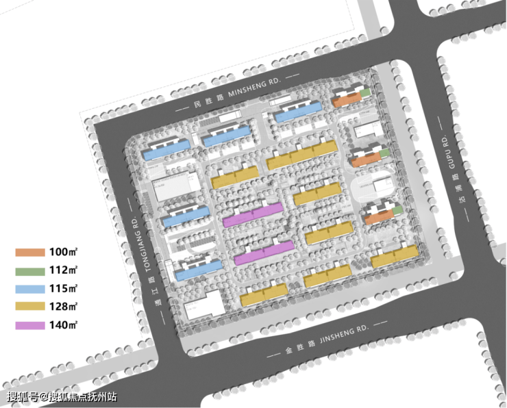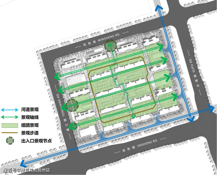 本案采用西低东高半围合式布局方式,着重打造东西向景观通廊,强调东西向的景观渗透,使小区内部与金胜河有良好的景观渗透与互动。中部洋房区域重点打造舒适静谧的内部东西向大景观,整个小区做到景观资源均衡,空间规整完善。营造一个景观空间多元,绿化层次丰富的生态友好型社区。