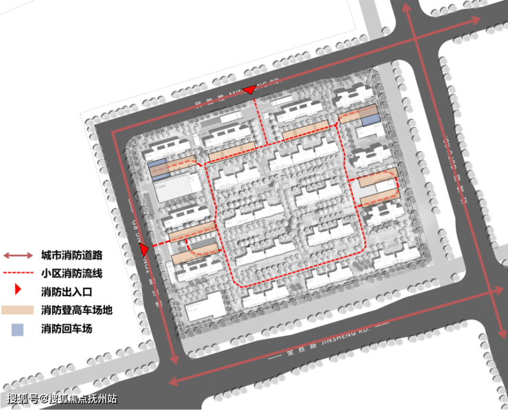 小区人行和车行出入口沿民胜路及通江路设置,所有住宅地面访客机动车停车均结合小区出入口设置。机动车在小区入口处就进入地库,行人通过小区入口进入组团。基地内部人流通过中心绿化带及步行景观走廊联系形成各个单元相连的封闭步行系统,交通组织流畅,并且有明确的限制,保证小区内部彻底实现人车分流。本案采用的主要停车方式为集中地下停车库停车,做到真正意义上的人车分流。