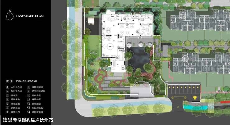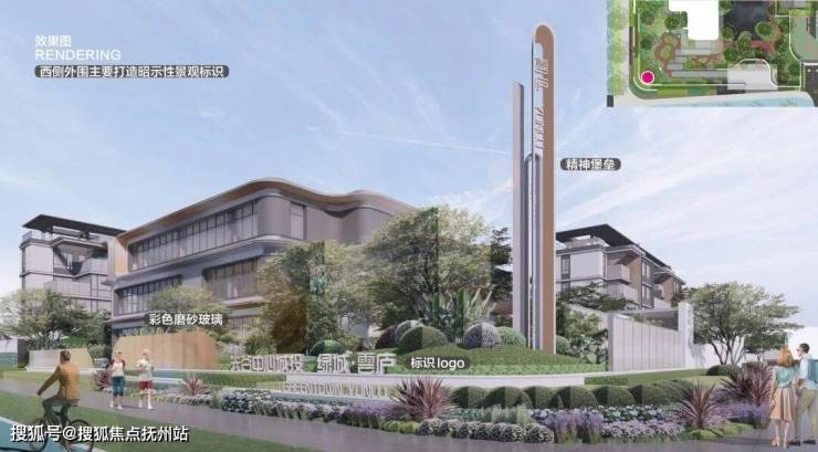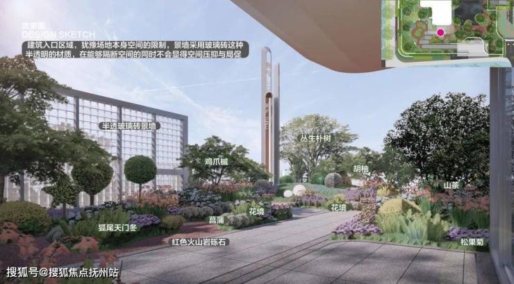 将入口处进行压缩设计,采用虚实界面景墙相结合的设计手法。同时,运用“精致”框景和对景细节。通过交错的铺装结构,使绿化景观形成多个小型组团节点,丰富游览流线。并采用半透明的玻璃材质作为街角及建筑入口处的隔断景墙,使空间既具有遮蔽性又不显拥堵。