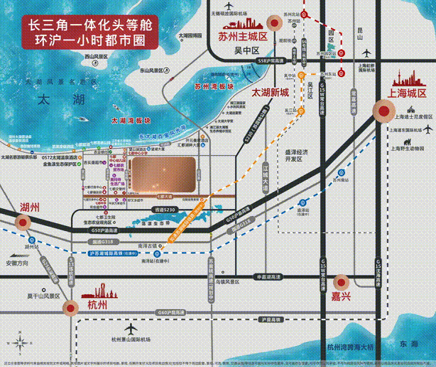 ?黄金干道:双城铁接驳(沪苏湖高铁、如通苏湖城际铁路-规划中),三横三纵便捷交通路网,周边环湖路、七都大道、亨通大道、常增路、望湖路、吴越路环绕,快速连接S230苏震桃公路、沪渝高速、练杭高速等快速路网。
