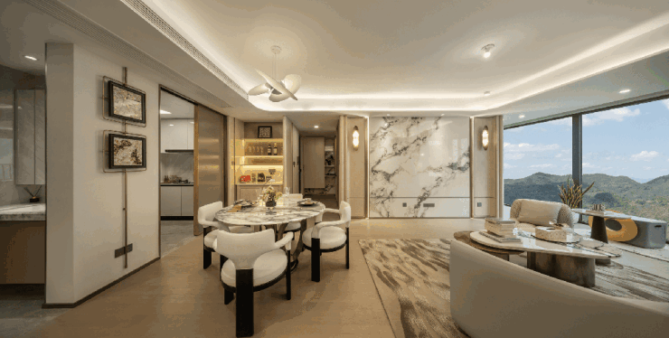 4大国际表达——奢石颜印:合院以金属型材+石材一体板搭配;光影诗意:全户型通透大面积玻璃运用;优雅气质:洋房深浅色调灵动搭配;艺术律动:洋房现代简约线条,舒展挺拔。