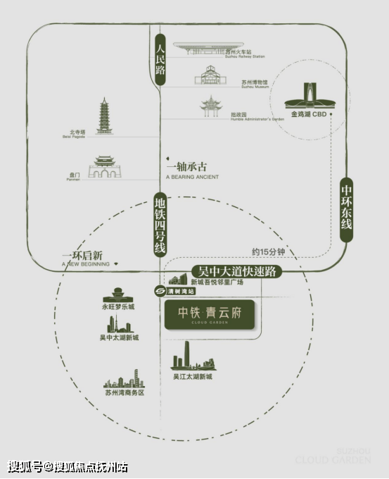 ◎发展之环:中环东接园区产经引擎,西融狮山创新脉络,南承太湖新城生态蓝图,北启高铁枢纽经济,便捷通达苏州多中心,启幕现代化城市发展新篇章。