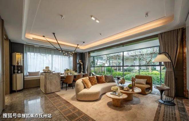 首层的餐客厅+9.8米跑道阳台的尺度感极强,形成超尺度“洄游聚厅”,客餐厅东侧超大全明飘窗,呈现约270°景观视野,将景观视野与室内尺度感提升至全新高度。