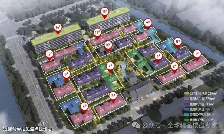 共14幢105户,合院联排12幢57套,洋房产品2幢48套,其中联排总高3层有270平(26套),310平(17套),合院335平(6套),365平(3套),390平(4套)最后一排是两幢总高7层(一楼架空)的洋房共48套。