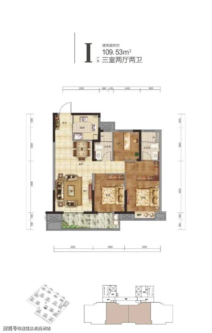 I户型建面约109.53平,三室两厅两卫:此户型位于中间户,连廊结构,三开间朝南,也是目前市场上非常流行的中间户。