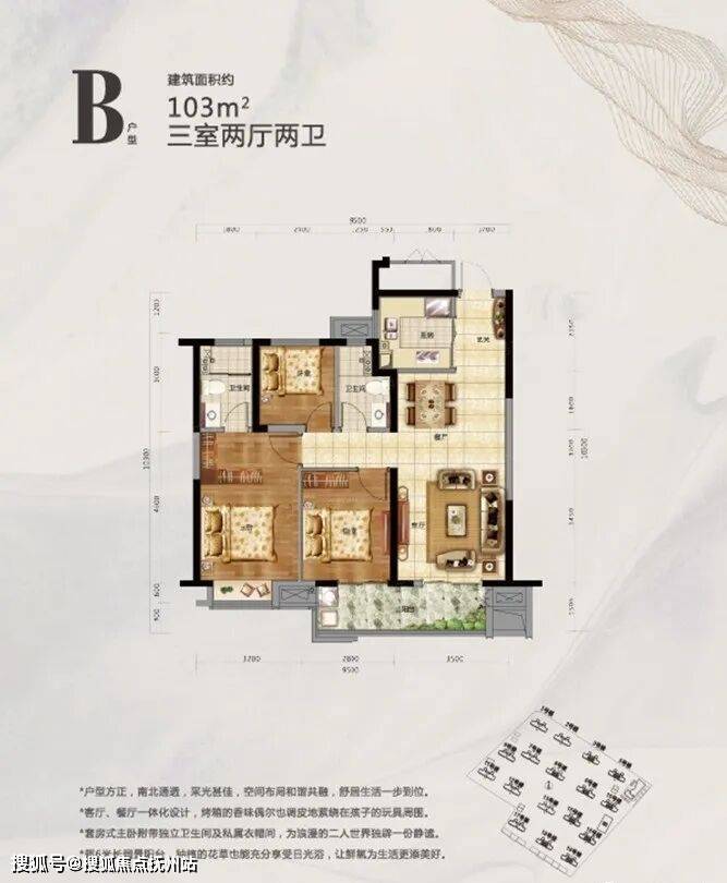 B户型建面约103㎡,三室两厅两卫:该户型位于中间户,与上面109㎡户型基本一样。