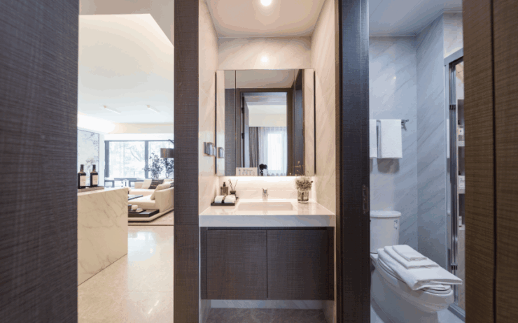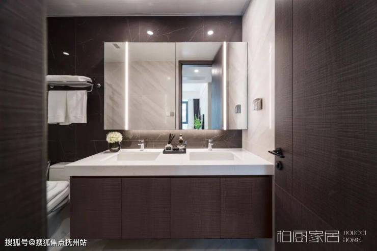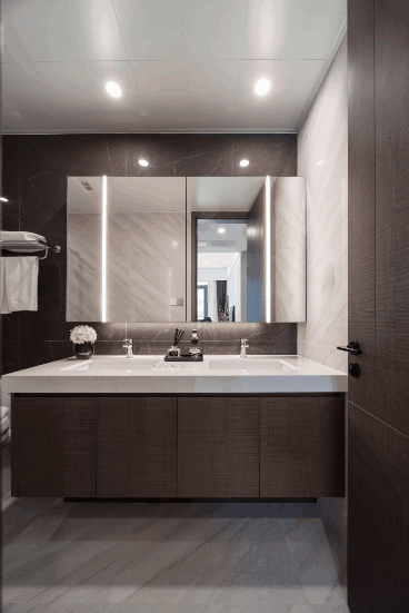 门墙柜一体化设计,使整个空间更为和谐,干净而纯粹的浴室,低饱和的色彩与木融合,组建起简练优雅的空间视觉,展现居家的不凡品位。