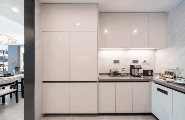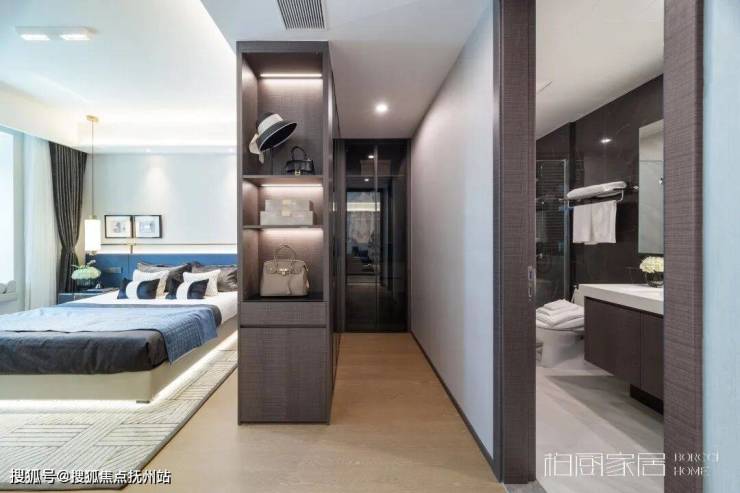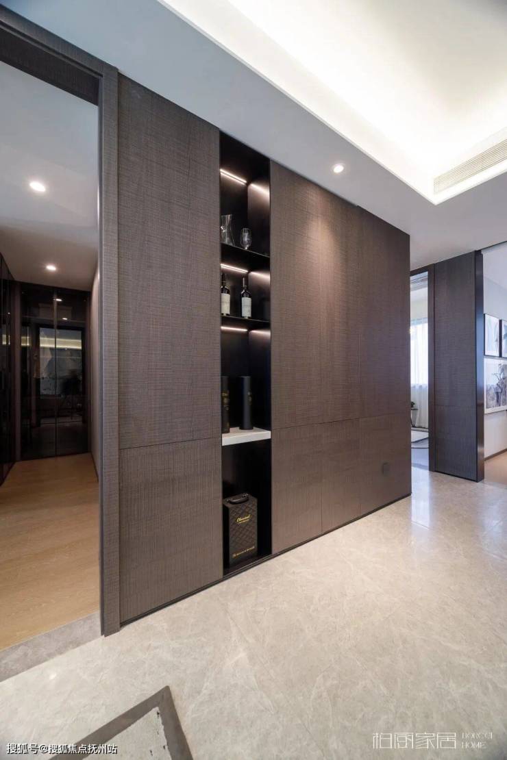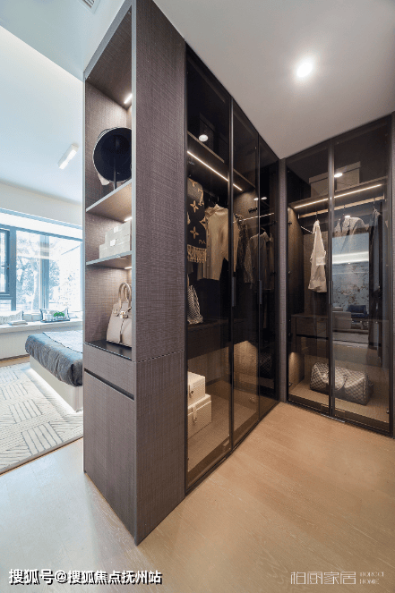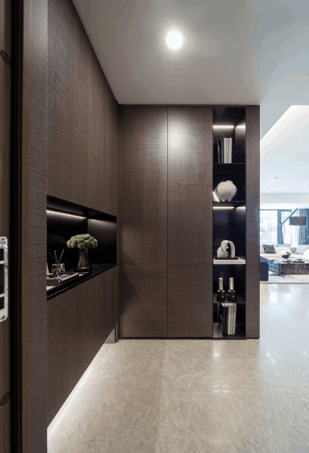 将功能动线进行有效的串联,通过一体化落地的表达形式,一目了然地看清楚物品,方便拿取,颜色上则以木纹搭配玻璃来呈现出简约又不失丰富,加以灯光,渲染别样意趣。