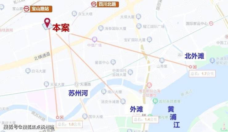 仅从图上看,该地块直线距苏州河约1公里,直线距外滩约1.4公里,直线距北外滩约1.7公里,直线距3/4号线宝山路站约300米,直线距10号线四川北路站约560米,区位优势明显。