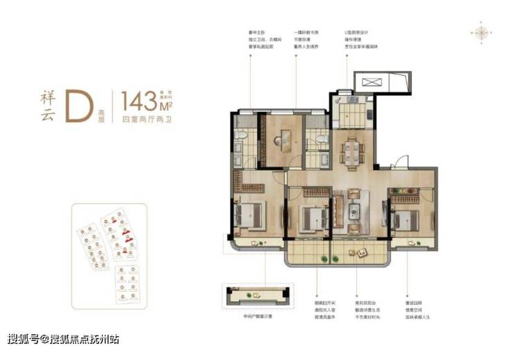 考量到家庭结构的成长,建筑面积约143㎡改善四房户型设计,配置主卧套房、阳光次卧、独立客卧、灵动书房、U型厨房、干湿分离双卫、客餐双厅一体,四室双厅大格局之下,满足家庭全龄段需求,让三代人的生活亲密而又独立。