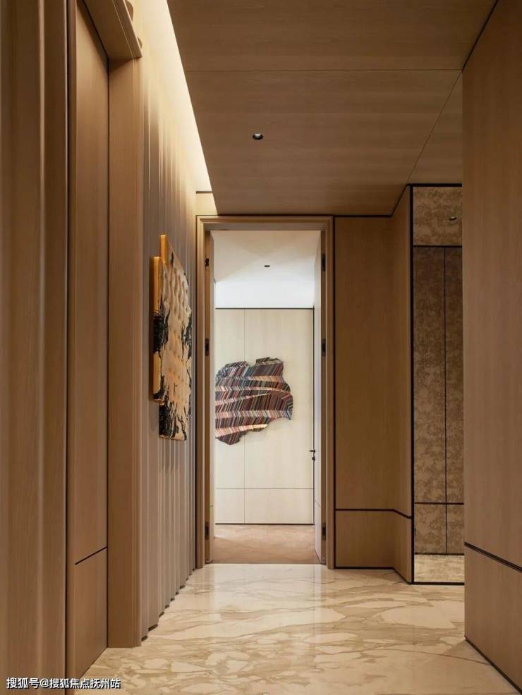 从高档材料的运用到开放式的空间布局,全屋奢石通铺,入户门厅匹配的是纹理低调的超白洞石搭配定制尺寸卡门,一眼看去,安全感满满。进门后,意大利进口石材全屋通铺,每一处地砖流水型纹路都能对应,需要提前至少2年预定的梅西同款进口芬迪白石材被用作电视背景墙,阔绰感不言而喻。