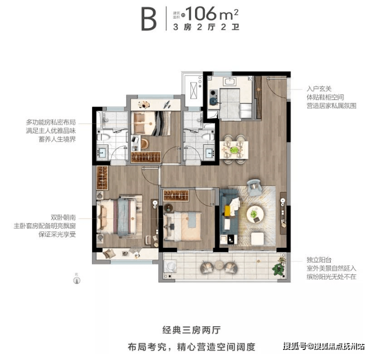 106㎡B户型三室两厅两卫,双阳台,整体是89㎡放大版本再加个内卫。