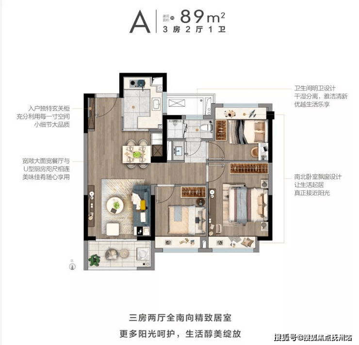 89㎡三房两厅一卫户型,是上城壹号的起步户型,小户型往往更加考验开发商的“真功夫”。