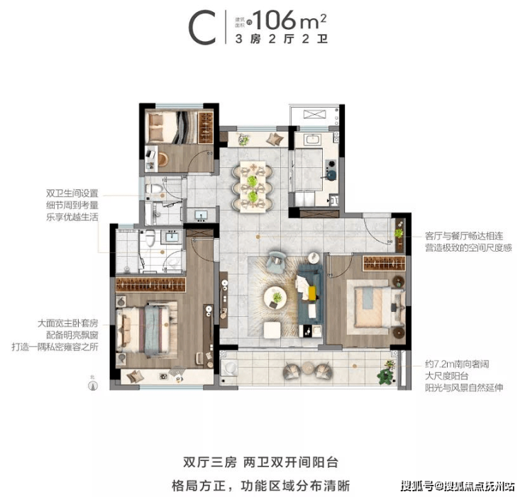 106㎡C户型依然是三室两厅两卫,户型设计成了四叶草户型。7.2米的大阳台是个亮点。主卧依旧带内卫,有点担心以后的这个卫生间的通风问题。售楼处电话:400-780-7338【贵宾热线】