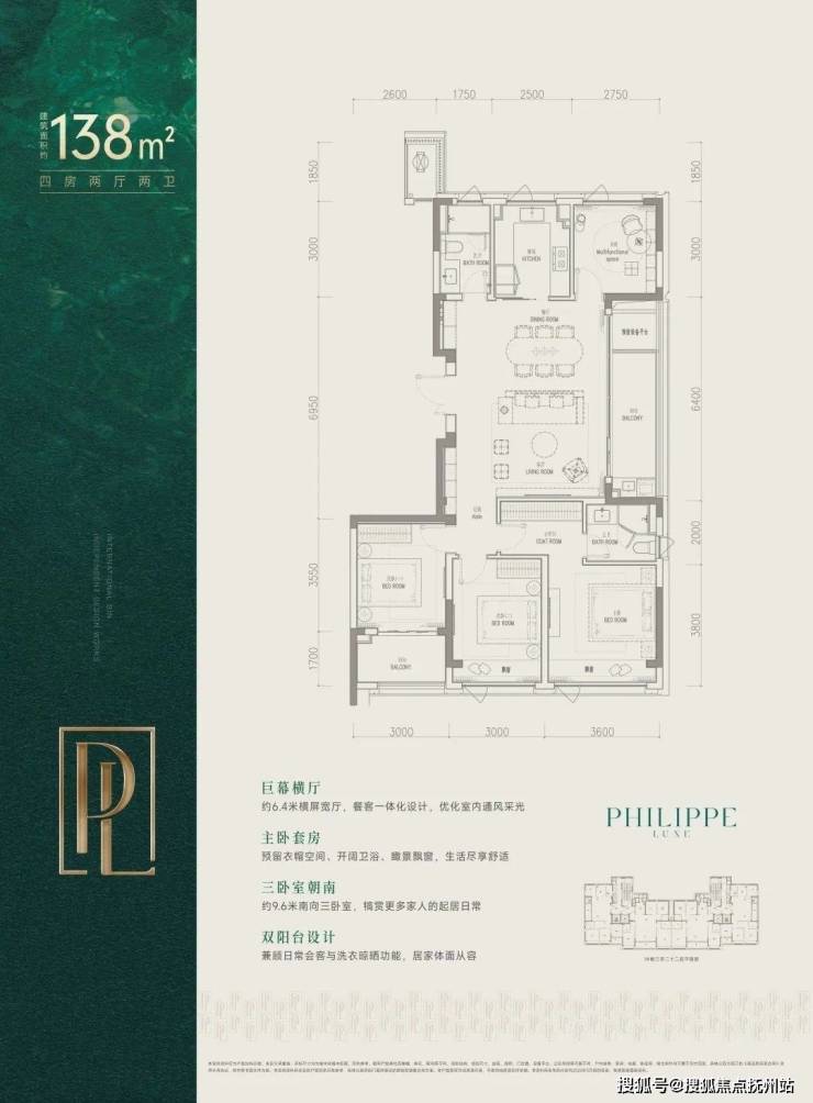 户型方面共有两款可选,起步户型为建面约138㎡边厅户型,四房两厅两卫,两梯两户,三房朝南,双阳台设置。