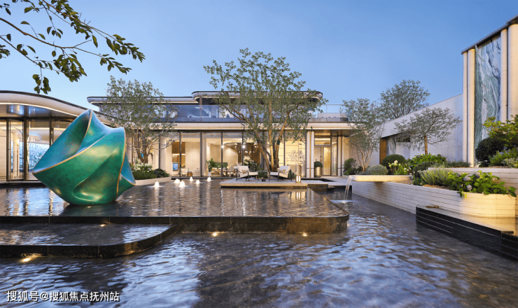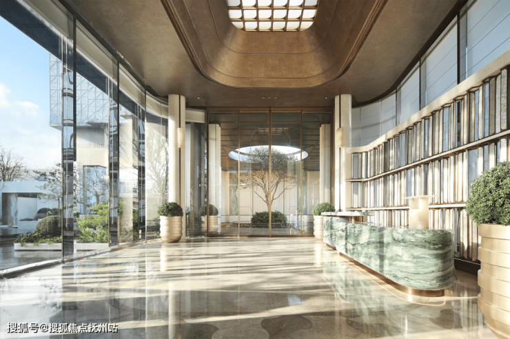 这处门庭采用贝金米黄石材、维多利亚绿、白雪公主奢石,结合古铜色金属板,形成冷暖撞色的张力美学,打开了城市奢度,每个细节透露出“贵”。圆形镂空穹顶,池中植入紫薇,寓意福祉盈门。