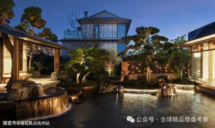 入口空间以“礼”为序,铺陈归家的开篇。前场开阔,石材铺地稳重而典雅,两侧绿植层次丰富,映衬出空间的静雅气息。中央水池铺陈而下,水面映照天光云影,伴随潺潺水声,赋予入口以灵动与生机。