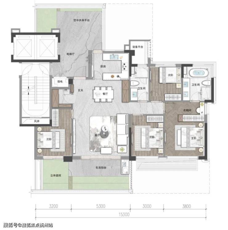 把空中平台+立体庭院+宽境阳台,悉数搬到平层,打造一个「空中花园大宅」。